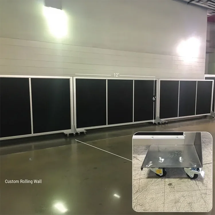 Our product offering includes innovative solutions tailored for spaces requiring division and privacy, like service tunnels and storage areas in large venues. We crafted a Custom Rolling Wall system, comprising 12’ wide by 6’ tall portable display panels mounted on lockable wheels.