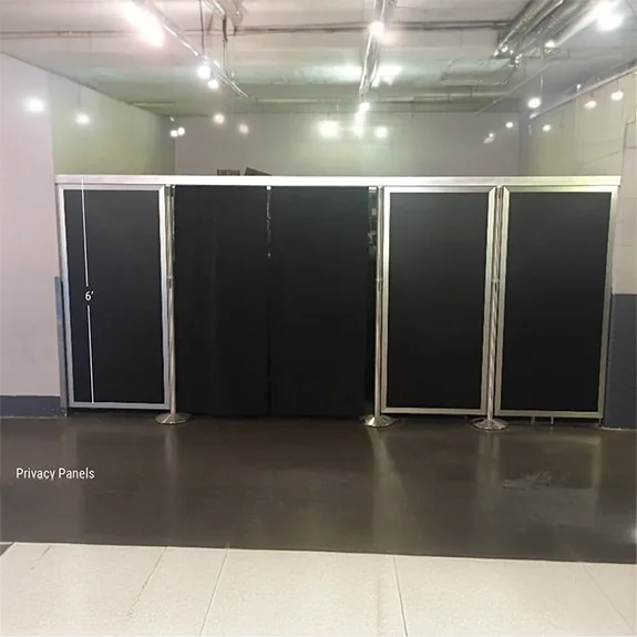 Additionally, we offer 6’ tall Privacy Panels, perfect for concealing storage spaces while maintaining an aesthetically pleasing and functional environment. Both products are customizable in size and finish, catering to specific needs, such as branded panel inserts or different dimensions. These products offer tailored solutions that meet the unique requirements of each project or event.