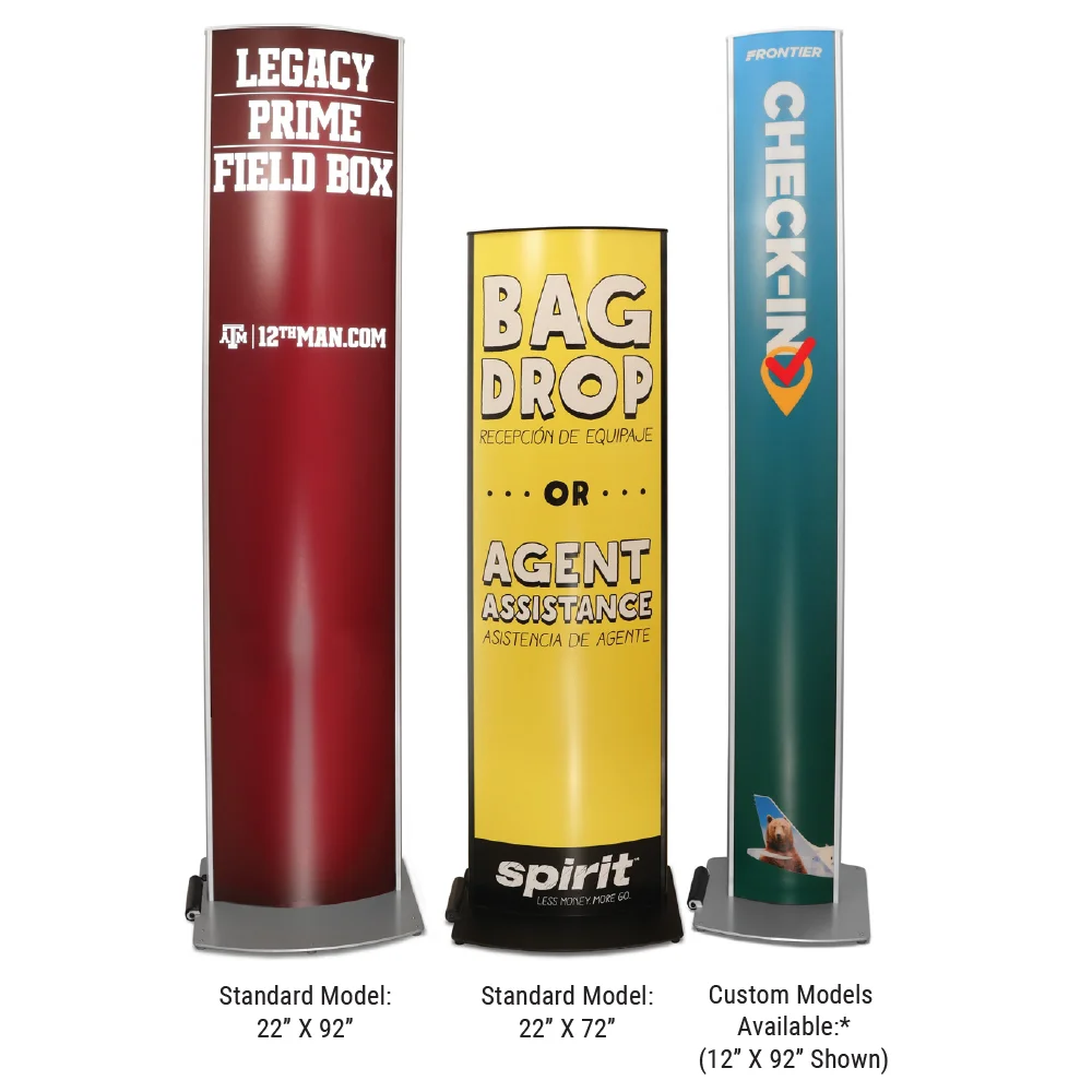 Custom sizes; Smooth Black or Silver finishes (additional powder coats available); single- or double-sided viewing; printed rigid PETG panels and curved Sintra backs; optional lighting; extended base (+30 lb) for added stability on select models.